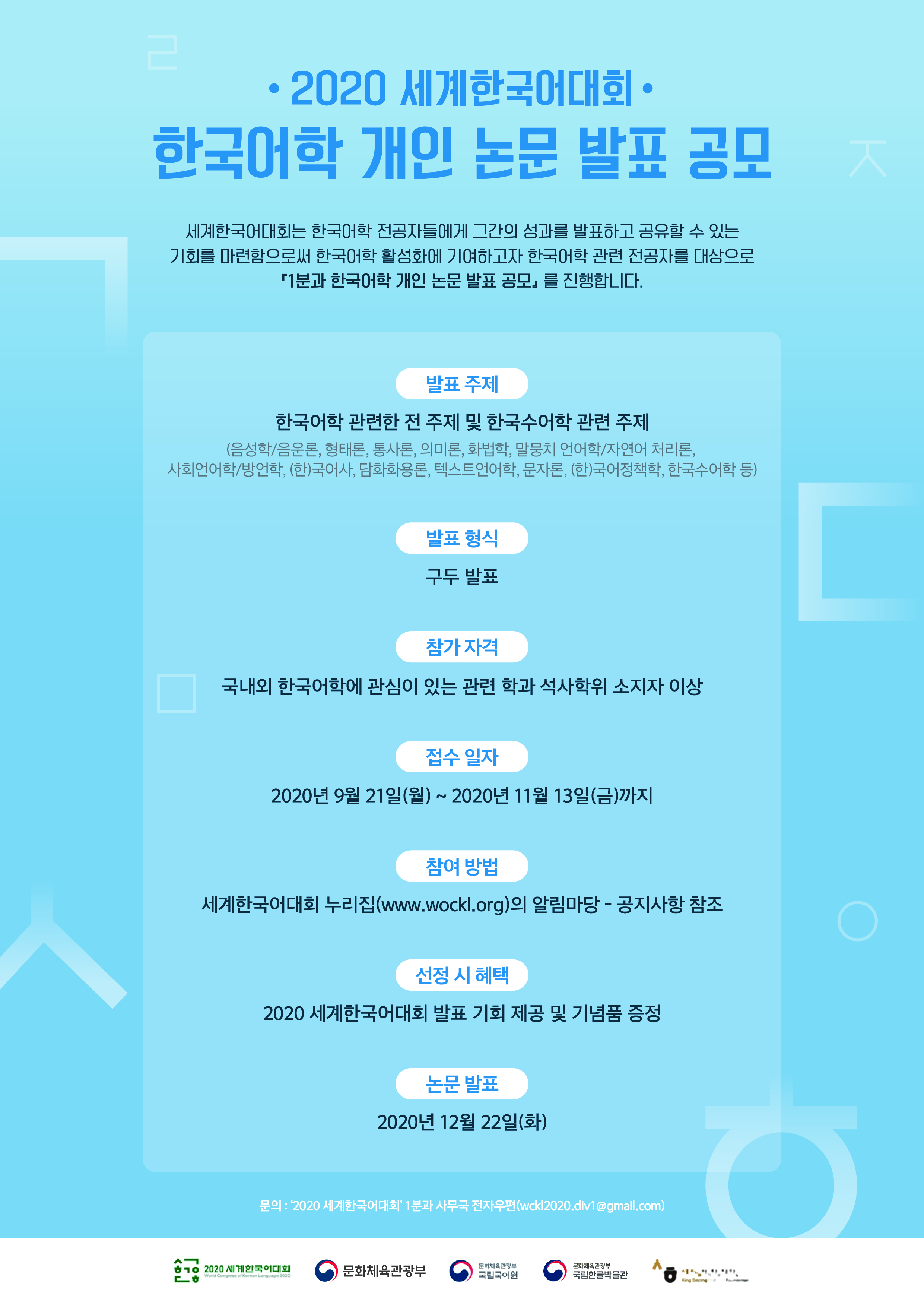 한국어에 대한 학문적 열정을 가진 전 세계 한국어학에 관심이 있는 관련 학과 석사학위 소지자 이상 여러분의 많은 참여를 바랍니다.