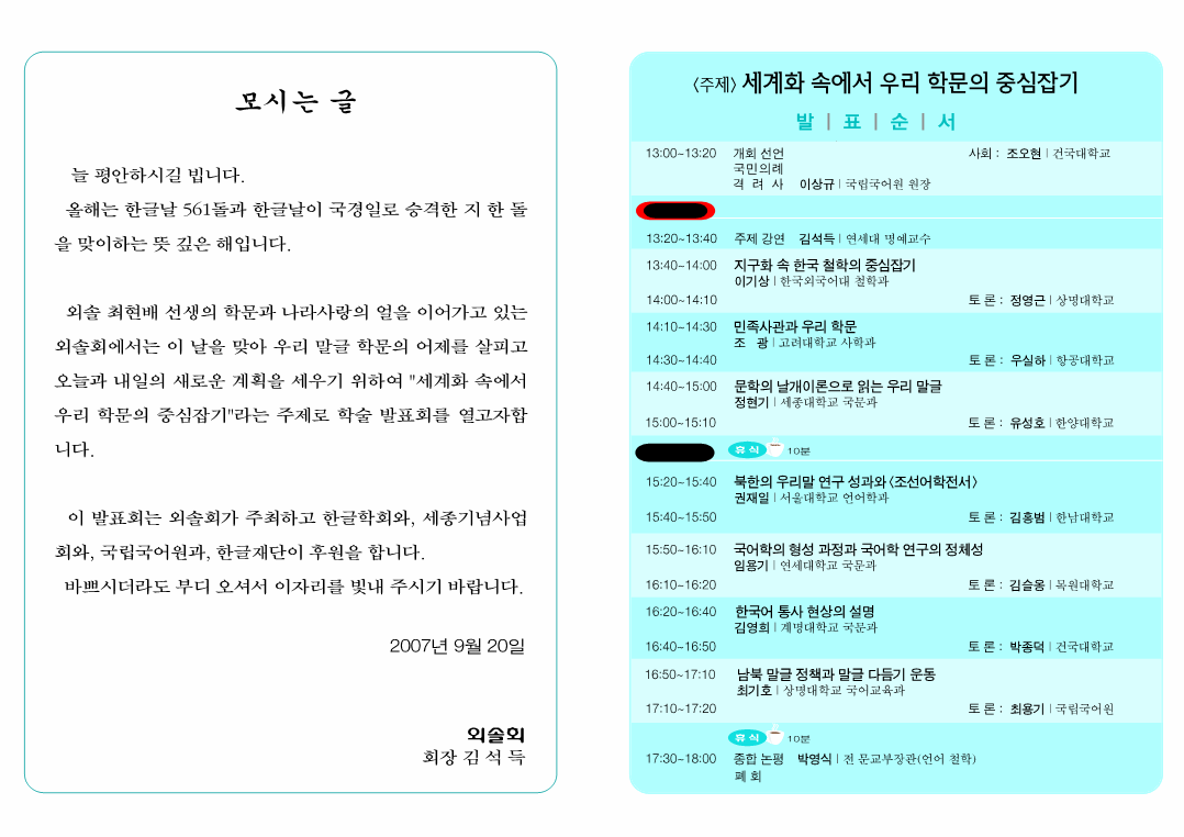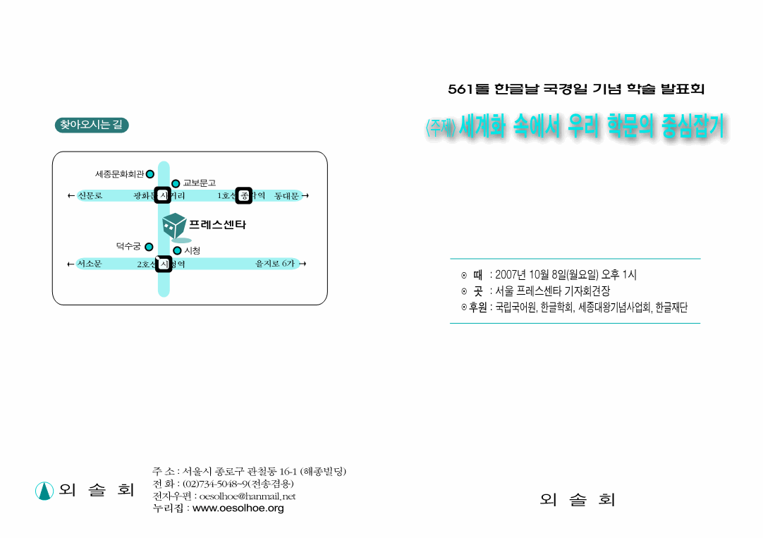 주제: 세계화 속에서 우리 학문의 중심 잡기때: 2007년 10월 8일 월요일 오후 1시곳: 서울 프레스센터 기자회견장후원: 국립국어원, 한글학회, 세종대왕기념사업회, 한글재단 자세한 내용은 덧붙인 사진 자료를 참고하세요.