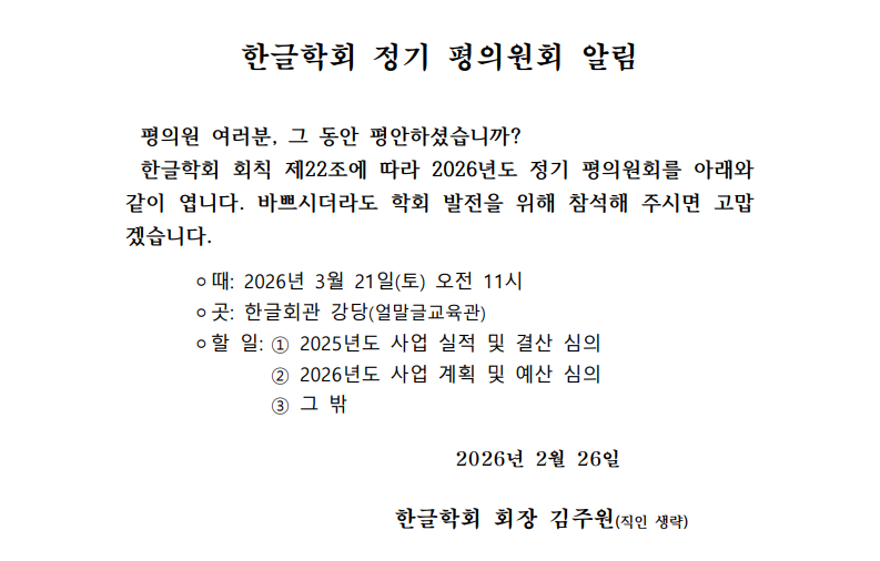 2026년도 한글학회 정기 평의원회 알림