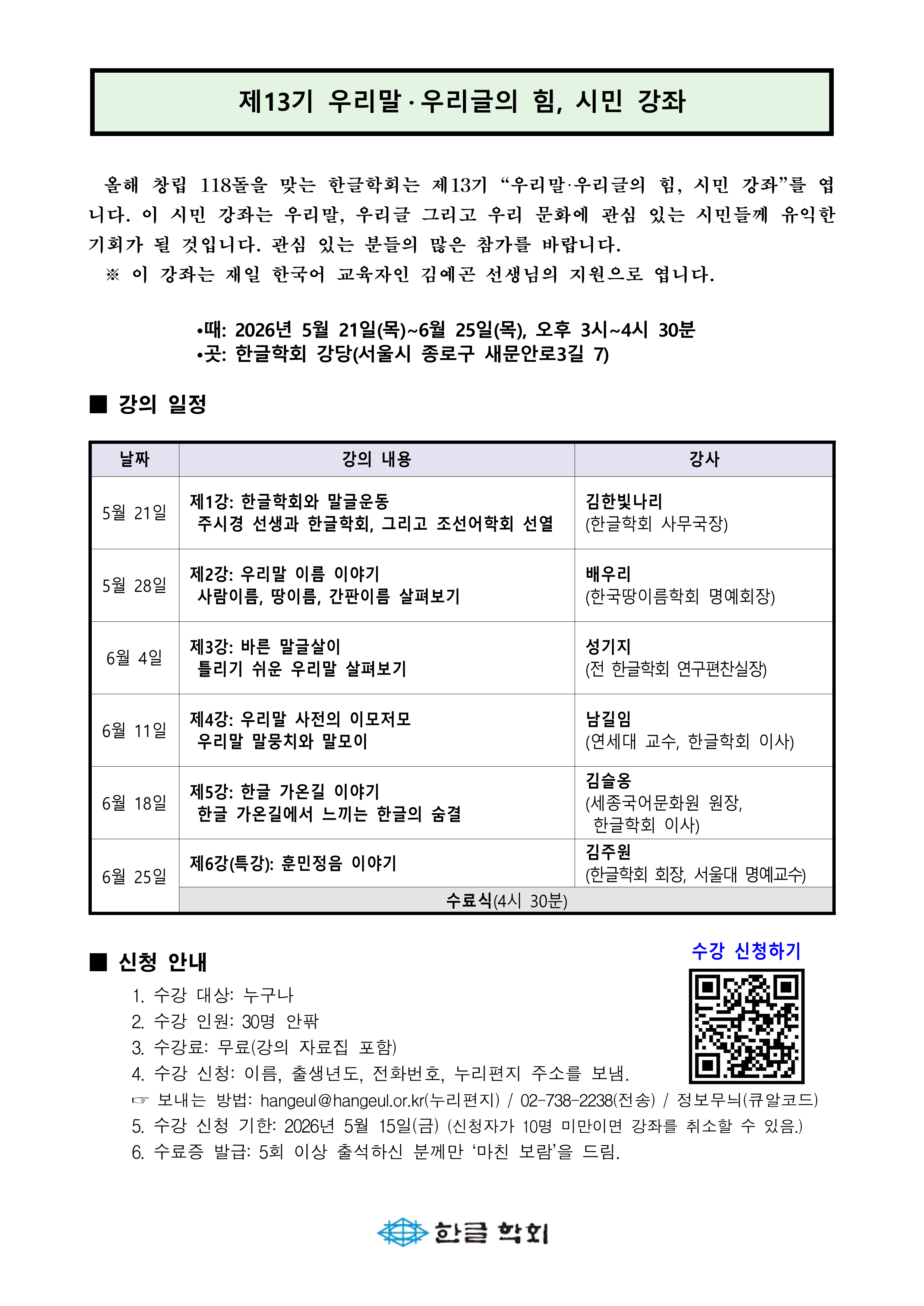 제13기 우리말·우리글의 힘, 시민 강좌를 엽니다.