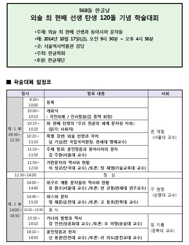 568돌 한글날 기념 <외솔 최 현배 선생 탄신 120돌 기념 학술대회>
