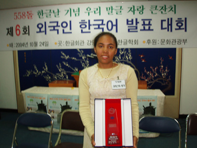 2004년 10월 24일(일) 오전 10시부터 한글 회관 강당에서 있은 외국인 우리 말글 자랑 큰잔치의 하나로 열린 '제6회 외국인 한국어 발표 대회'에서 크리스타 캄가(카메룬, 선문대, 사진) 님이 '시 감상문-알 수 없어요'란 제목으로 발표하여 으뜸기림을 차지하였습니다.