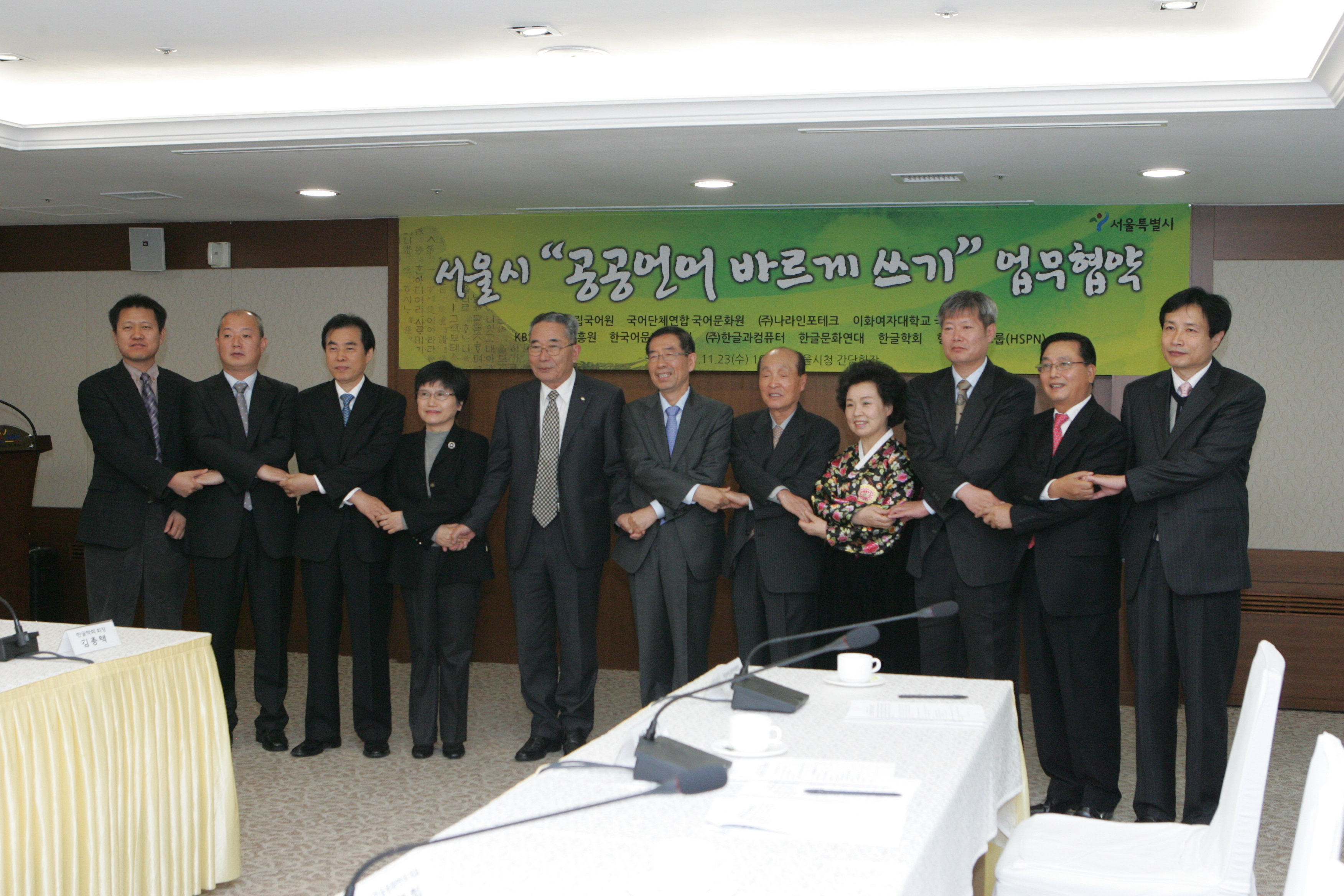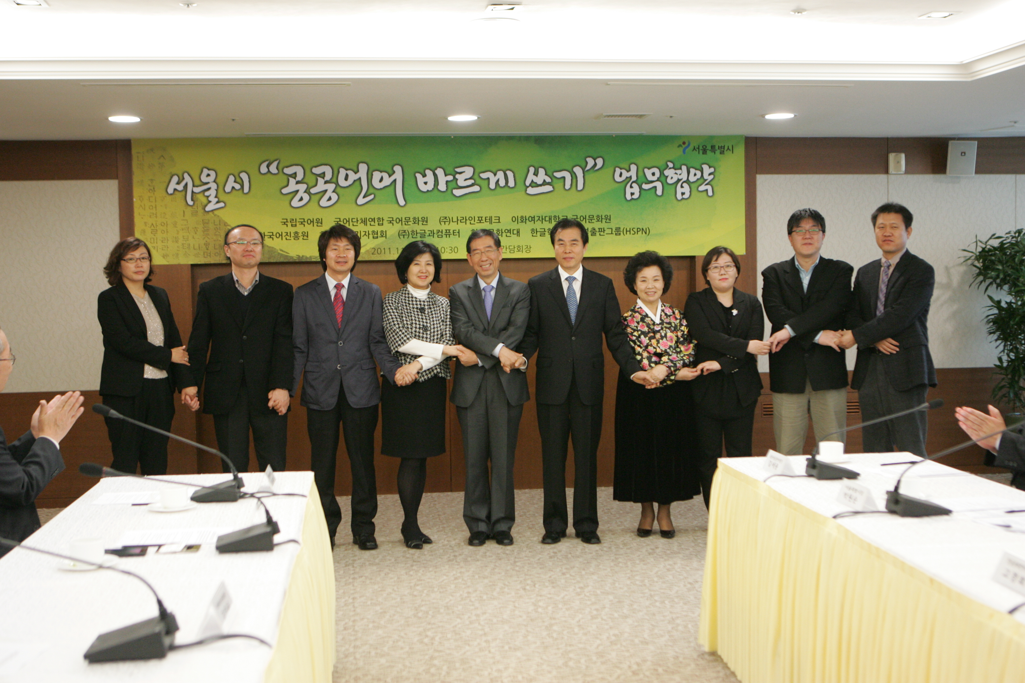 △ 위 사진: 2011년 11월 23일 오전 10시 30분 서울시청(서소문 별관) 13층 간담회장에서 서울시와 '서울시 공공언어 바르기 쓰기' 업무 협약을 맺은 기관과 단체 대표들의 모습. 왼쪽부터 이 경우 회장(한국어문기자협회), 박 현우 원장(케이비에스 한국어진흥원), 남 영신 원장(국어단체연합 국어문화원), 강 진옥 원장(이화여대 국어문화원), 김 종택 회장(한글학회), 박 원순 시장(서울특별시), 장 지익 회장(형설출판그룹), 고 경희 대표(한글문화연대), 김 세중 단장(국립국어원 공공언어지원단), 이 홍구 대표이사(한글과컴퓨터), 권 혁철 대표이사(나라인포테크).