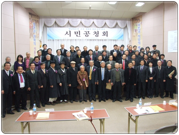 ▲ 2011년 2월 11일 오후 2시부터 서울기독교청년회관(YMCA, 종로2가) 대강당에서 열린 '한글마루지 조성/광화문 현판 다시 걸기 시민 공청회'의 모습. 만세삼창을 이끌고 있는 짚신문학회 오동춘 회장(위 사진)과 공청회에 참석한 이들의 모습(아래 사진).