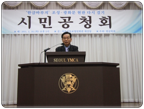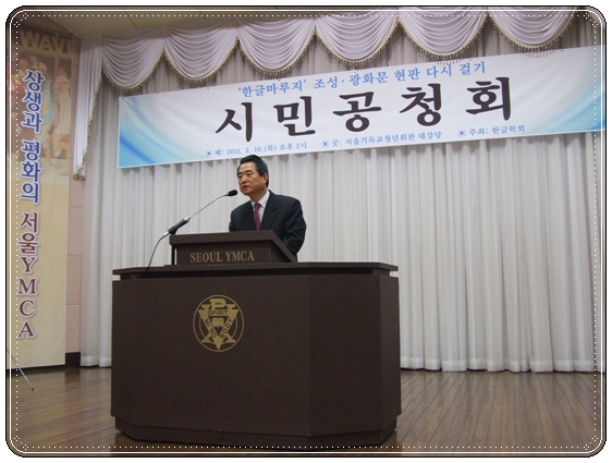▲ 2011년 2월 11일 오후 2시부터 서울기독교청년회관(YMCA, 종로2가) 대강당에서 열린 '한글마루지 조성/광화문 현판 다시 걸기 시민 공청회'의 모습. 3분 의견 발표를 하고 있는 김동진 헐버트박사기념사업회 회장(위 사진)과 임종건 전 한국경제신문 사장(아래 사진)의 모습.