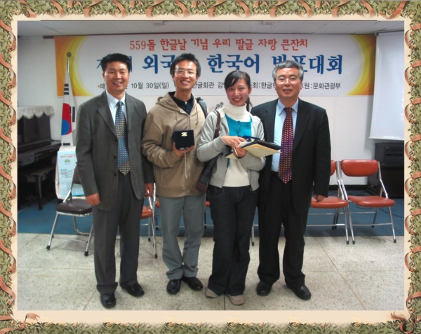 2005년 10월 30일 10시부터 한글회관 5층 강당에서 있었던 제7회 외국인 한국어 발표 대회의 모습입니다. 사진은 추킴기림을 받은 대필뢰(중국, 왼쪽에서 두 번째, 으뜸기림을 받은 주손원(중국) 님과 한글학회 유운상 사무국장(오른쪽 첫 번째), 김한빛나리 연구원입니다. <찍은 이: 김영조(2005. 10. 30.)>