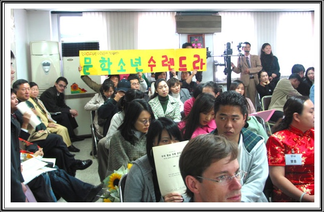 2005년 10월 30일 10시부터 한글회관 5층 강당에서 있었던 제7회 외국인 한국어 발표 대회의 모습입니다. 사진은 발표자를 응원하러 나온 어느 방청객의 응원 모습입니다. '문학소년 수렌드라' <찍은 이: 김영조(2005. 10. 30.)>