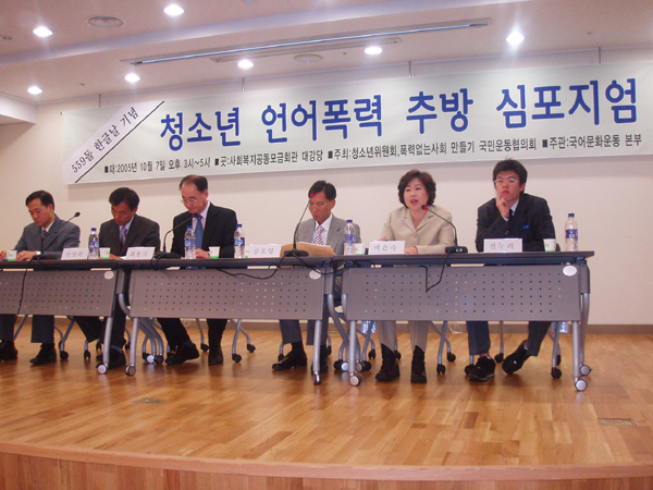 2005년 10월 7일 (금) 오후 3시부터 사회복지공동모금회관 대강당에서 있었던 '청소년 언어폭력 추방 심포지엄'(주최: 청소년위원회/폭력 없는 사회 만들기 국민운동 협의회, 주관: 국어문화운동 본부)의 한 모습입니다. 사진은, 발표자와 토론자로 나선 이들(왼쪽부터 김형배 한글문화연대 운영위원, 박영하 서울여상 교사, 최용기 국립국어원 학예연구관, 강호영 서울 성남고 교사, 백은숙 학부모, 전누리 학생)의 모습입니다. <찍은 이: 꿈돌이(2005.10.7.)>