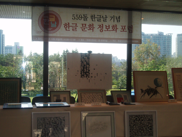 2005년 10월 6일 (목) 오후 2시부터 국회 국회의원회관 대회의실에서 있었던 한글인터넷주소추진총연합회 주최 제2회 한글 문화 정보화 포럼 행사의 한 모습입니다. 사진은 한글 시화 전시 모습입니다. <찍은 이: 꿈돌이(2005.10.6.)>