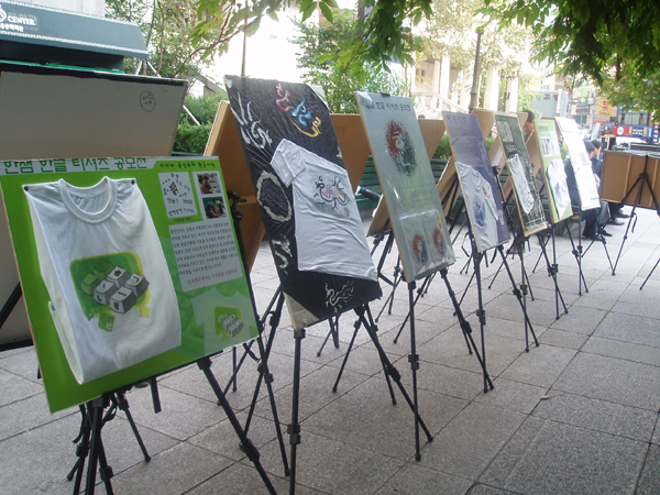 2005년 10월 5일 (수) 오전 11시부터 서울 세종문화회관 분수대광장에서 있었던 한글날 기념 '한글무늬옷(한글티셔츠) 공모 작품 전시와 나눠주기' 행사의 한 모습입니다. <찍은 이: 꿈돌이, 2005년 10월 5일.>