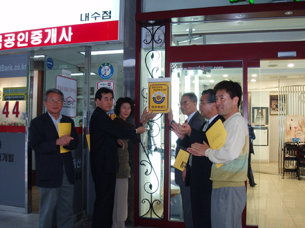 2005년 9월 28일 (수) 오후 5시부터 서울 종로구 내수동 경희궁의 아침 3단지 상가에 있는 '머리에봄'(원장 김미선)에서 2005년 세 번째 아름다운 우리말 가게이름 행사를 하고 있는 모습입니다. 사진은, 한글 학회 김계곤 회장이 머리에봄 김미선 원장, 행사 참석자들과 함께 '아름다운 우리말 가게이름' 보람(상징 현판)을 걸고 있는 모습입니다. <찍은 이: 꿈돌이, 2005년 9월 28일.>