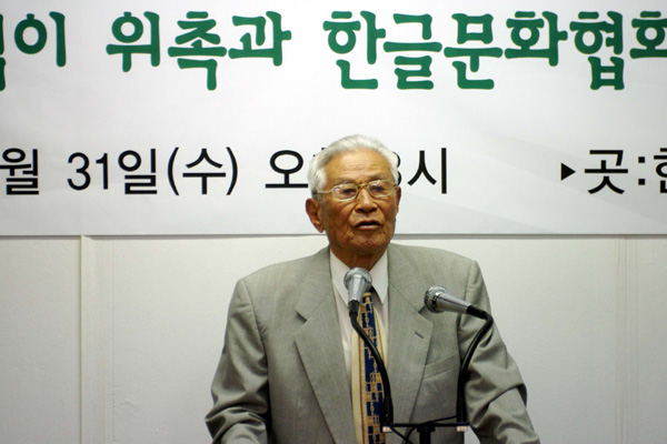 2005년 8월 31일 (수) 오후 3시부터 한글 회관 강당에서 있은 한글 학회 세운 97돌 기념 잔치의 한 모습입니다. 이 그림은 '광복 60돌을 되돌아보고 내다본다'란 주제로 특별 발표를 하고 있는 이 강로 한글 학회 명예이사님의 모습입니다. <찍은 이: 참말로, 2005년 8월 31일.>