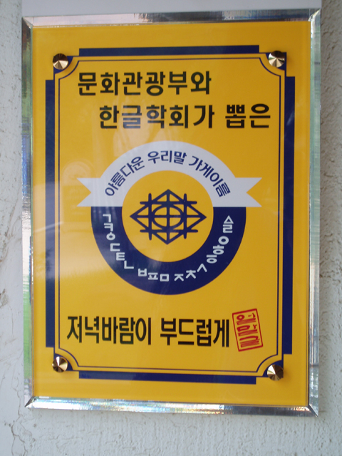 2005년 7월 25일 (월) 오후 4시부터 경기도 남양주시 조안면 능내리에 있는 '저녁바람이 부드럽게'에서 있은 2005년 첫 번째 아름다운 우리말 가게이름의 상징보람(현판)입니다. <찍은 이: 꿈돌이, 2005년 7월 25일.>