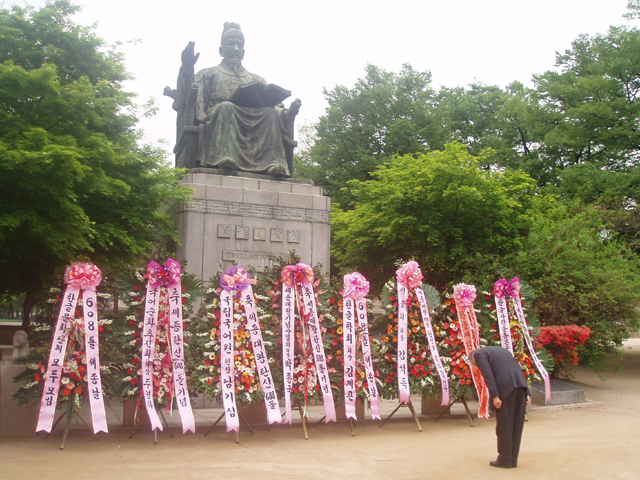 2005년 5월 14일 (토) 오전 9시부터 덕수궁 세종대왕 동상 앞에서 있은 '608돌 세종날 기념 꽃바치기 모임'에서 한글재단 이상보 회장을 대신하여 박우철 사무총장이 꽃을 바치고 나서 묵념하는 모습입니다. <찍은 이: 꿈돌이, 2005년 5월 14일.>