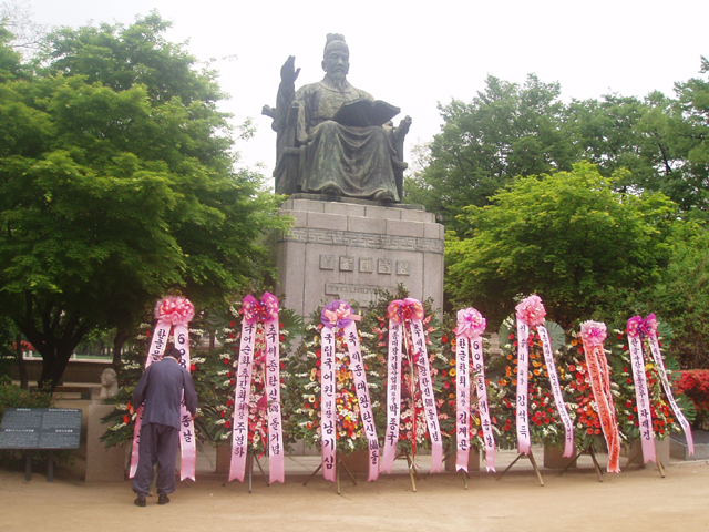 2005년 5월 14일 (토) 오전 9시부터 덕수궁 세종대왕 동상 앞에서 있은 '608돌 세종날 기념 꽃바치기 모임'에서 한글문화단체모두모임 이상보 회장을 대신하여 이대로 사무총장이 꽃을 바치고 있는 모습입니다. <찍은 이: 꿈돌이, 2005년 5월 14일.>