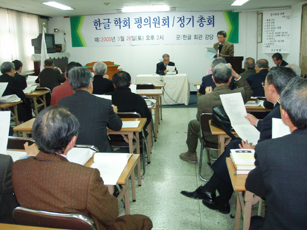 2005년 3월 26일 (토) 오후 2시부터 한글 회관 강당에서 있은 '2005년도 한글 학회 평의원회/정기총회'에서 지회 보고를 하고 있는 모습니다. 이 그림은 부산지회 류 영남 지회장을 대신해서 최 낙복 회원(동아대 교수)님이 보고하고 있는 모습입니다. (찍은 이: 꿈돌이, 2005년 3월 26일.)