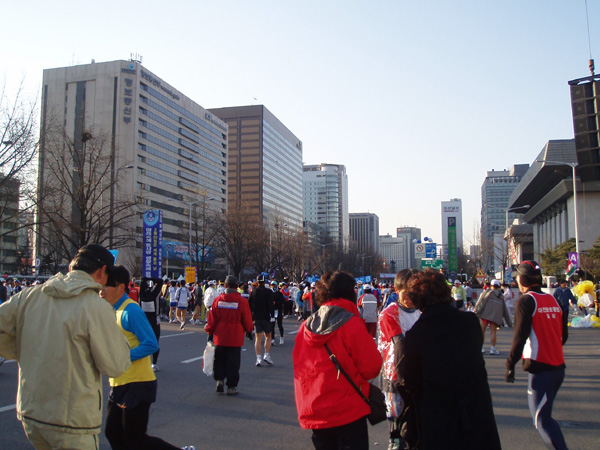 2005년 3월 13일 (일) 아침, '2005서울국제마라톤대회 겸 제76회동아마라톤대회 출발지인 세종로(세종문화회관 앞)에서 참가 선수들이 출발을 기다리고 있는 모습. 이 날 한글날국경일제정범국민추진위원회가 주최하고 한글학회, 세종대왕기념사업회, 외솔회, 한글인터넷주소총연합회가 후원하여 이 마라톤 대회에서 한글날 국경일 제정 추진을 위한 홍보 운동을 하였다. 새벽부터 한글 학회 직원들과 관련 단체 회원들, 김제에서 마라톤 대회에 참가하기 위해 올라 온 정 갑주 할아버지 외 20여 명 등 한글 사랑을 실천하는 이들은, 마라톤 대회에 참가한 선수들의 등에 '한글날을 국경일로!'(가로 27.5×8.5㎝)라고 세긴 등판 딱지(스티커) 5,000장을 붙여 주거나 나누어 주었다. (찍은 이: 꿈돌이, 20050313.)