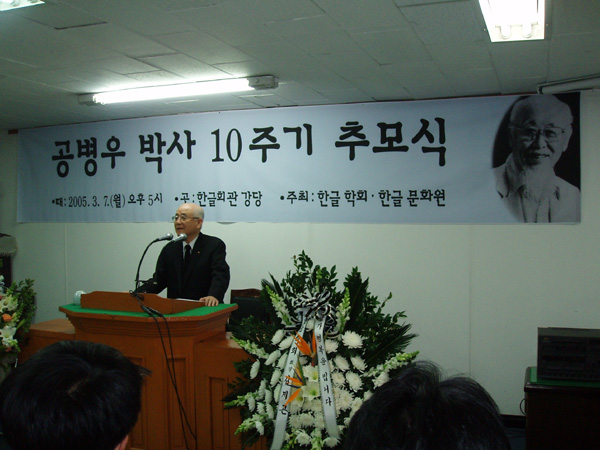 2005년 3월 7일 (월) 오후 5시에 한글 회관 강당에서 있은 공병우 박사 10주기 추모식에서 문 제안(한글집 임자) 선생님께서 추모말씀을 하고 있는 모습입니다. (찍은 이: 꿈돌이, 20050307.)