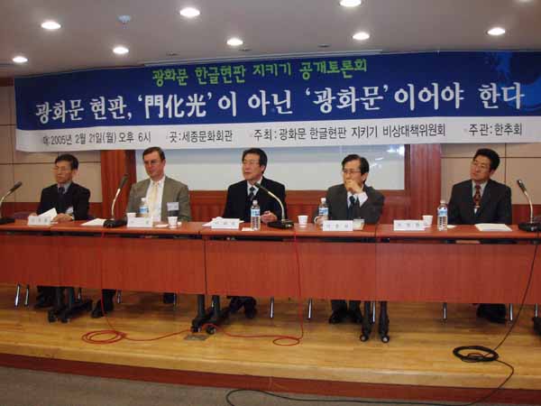 2005년 2월 21일 (월) 오후 6시부터 세종문화회관(4층, 컨퍼런스홀)에서 있은 '광화문 한글 현판 지키기 토론회'에서 주제 발표와 토론자로 나선 이들의 모습. 왼쪽부터 김 영환 교수(부경대 철학과), 이 참 대표(참 스마트 대표/방송인), 이 대로 대변인(사회자, 광화문 한글 현판 지키기 비상대책위원회), 이 봉원 회장(전국 국어운동대학생동문회), 조 영환 대표(울진타임즈). (찍은 이: 꿈돌이, 20050221.)
