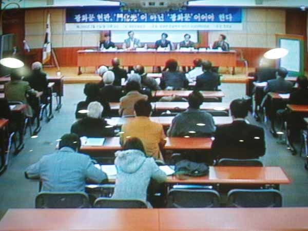 2005년 2월 21일 (월) 오후 6시부터 세종문화회관(4층, 컨퍼런스홀)에서 있은 '광화문 한글 현판 지키기 토론회'의 한 모습. 이 행사는 '한글인터넷 주소 추진 총연합회'(회장: 최 기호)의 협찬으로 '광화문 한글 현판 지키기 비상대책위원회'(대변인: 이 대로)에서 주최하였는데, 이 날 토론회에 초청한 유홍준 문화재청장과 정양모 문화재위원장은 참석하지 않았습니다. (찍은 이: 꿈돌이, 20050221.)