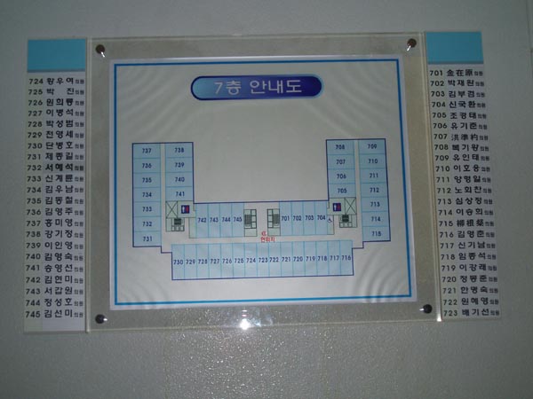 국회의원 회관 7층에 있는 의원실 안내도입니다. 45명의 의원님 가운데 42명은 한글로 적혀 있는데 세 사람만이 한자로 적혀 있어 눈에 거슬립니다.(찍은 이: 꿈돌이, 2005년 1월 28일 국회 의원 회관에서).