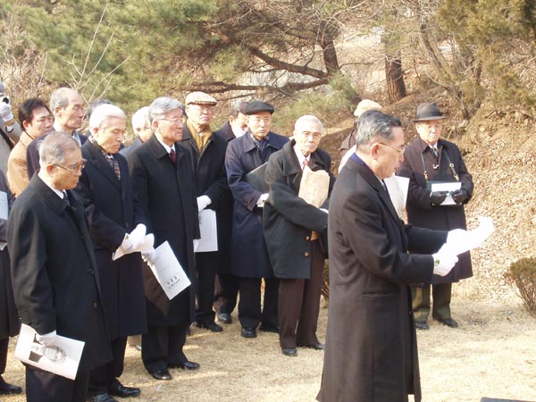 2005년 1월 26일 (수)에 모란공원 안 눈뫼 스승 무덤터(경기도 남양주시 화도읍 월산리)에서 가진 1주기 추모식의 한 모습. 이 강로(한글 학회 명예이사) 님의 추모사를 김 종택 이사(경북대 교수)가 대독하는 모습. (찍은 이: 꿈돌이, 20050126.)