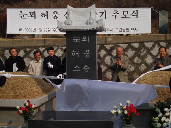 2005년 1월 26일 (수)에 모란공원 안 눈뫼 스승 무덤터(경기도 남양주시 화도읍 월산리)에서 새로 세운 묘비를 제막하는 모습. (찍은 이: 꿈돌이, 20050126.)