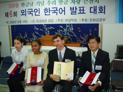 2004년 10월 24일 (일) 오전 10시부터 한글회관 강당에서 있은 '제6회 외국인 한국어 발표 대회'에서 상을 받은 이들의 모습. 왼쪽부터 리마이 올라(뽑힘기림, 알바니아), 크리스타 캄가(으뜸기림, 카메룬), 유라 솔로마하(추킴기림, 우크라이나), 사쿠라이 다카요시(뽑힘기림, 일본).