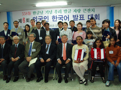 2004년 10월 24일 (일) 오전 10시부터 한글회관 강당에서 있은 '제6회 외국인 한국어 발표 대회'를 마치고 심사위원(앞줄 왼쪽부터 조 재수, 김 석득, 이 현복, 김 계곤, 김 승곤 님)들과 대회 참가자들의 모습.