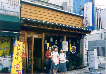 2004년 9월 15일, 강남 중학교 '사회 참여 체험 학습의 날'에 인사동에서 거리 간판 조사를 하면서 '학교종이 땡땡' 앞에서 찰칵. 학생들 인솔하느라 고생하신 신 미숙 선생님과 민정, 그리고 명희.