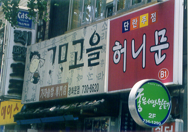 2004년 9월 15일, 강남 중학교 '사회 참여 체험 학습의 날'에 광화문 한글 학회 이웃지역에 있는 거리 간판의 한 모습.