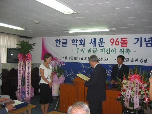 2004년 세 번째로 뽑힌 '우리 말글 지킴이'(박 인숙, 진주문화방송 아나운서)에게 위촉패를 전달하고 있는 김 계곤 회장의 모습. <사진: 이 대로>
