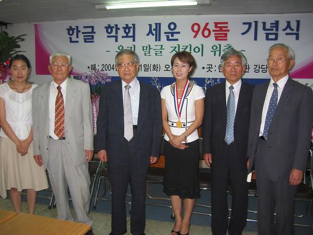 왼쪽부터 박 지홍 명예이사 손녀, 이 강로 명예이사, 김 계곤 회장, 박 인숙 아나운서(지킴이), 김 승곤 부회장, 박 붕배 이사. <사진: 이 대로>